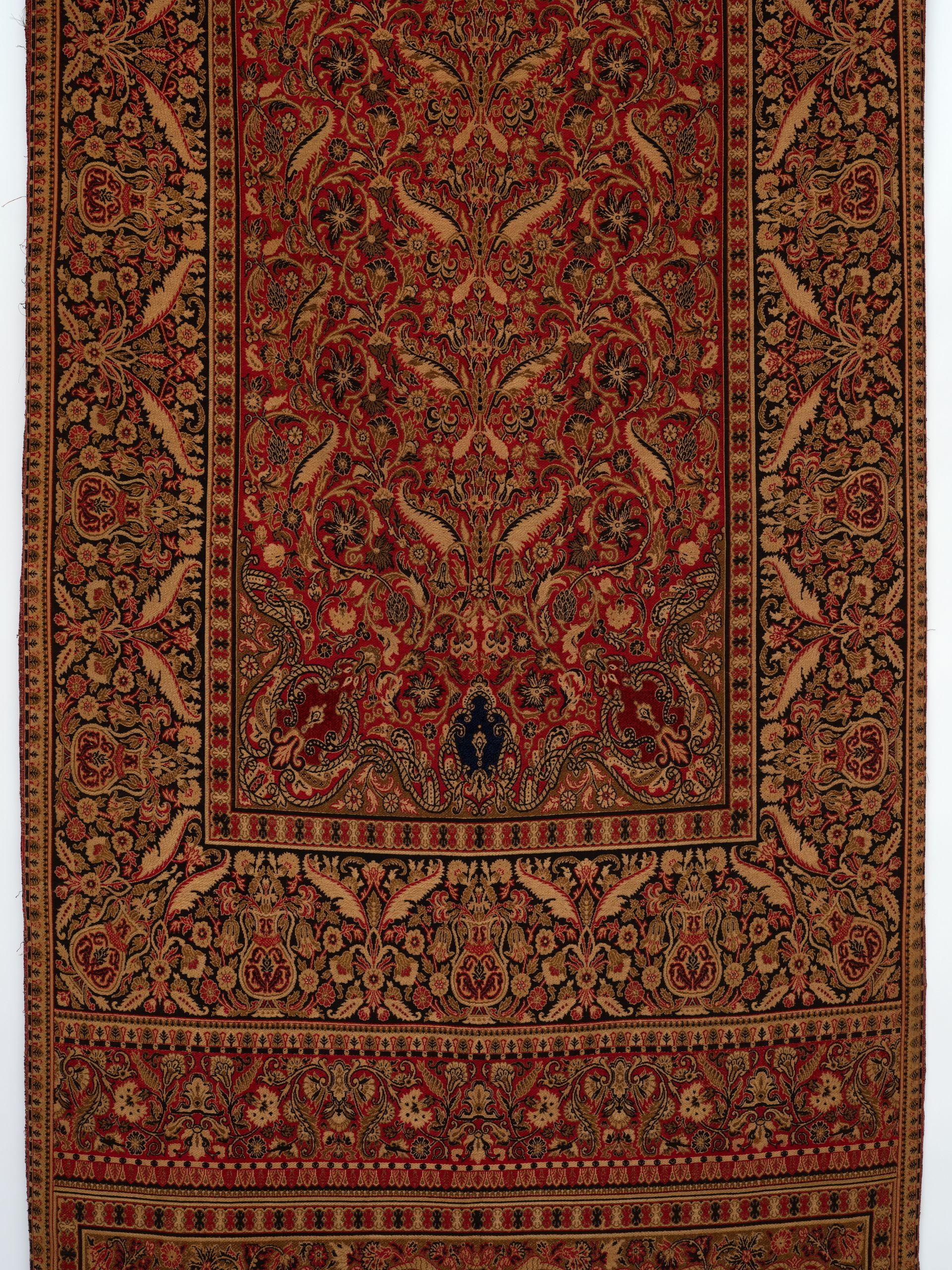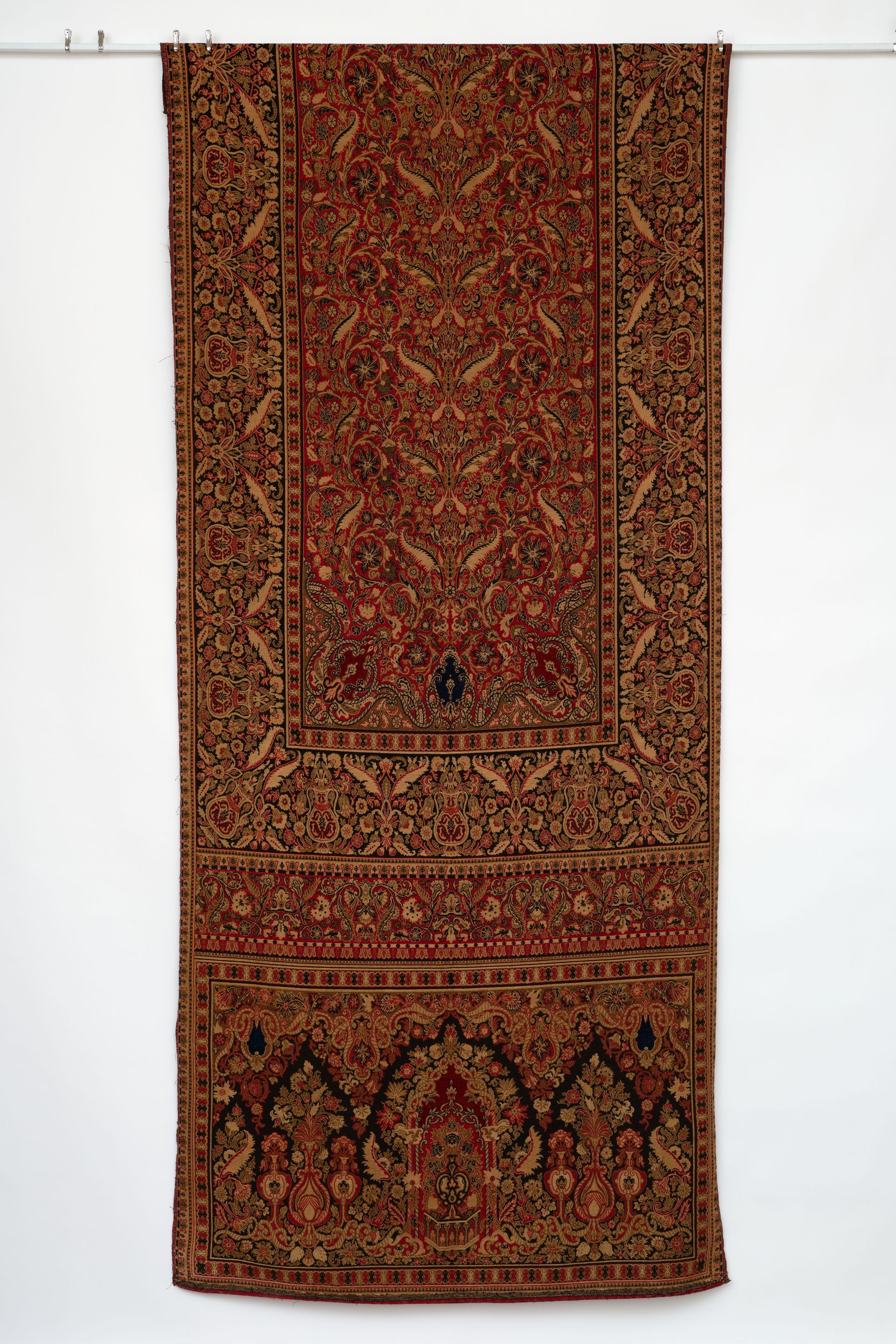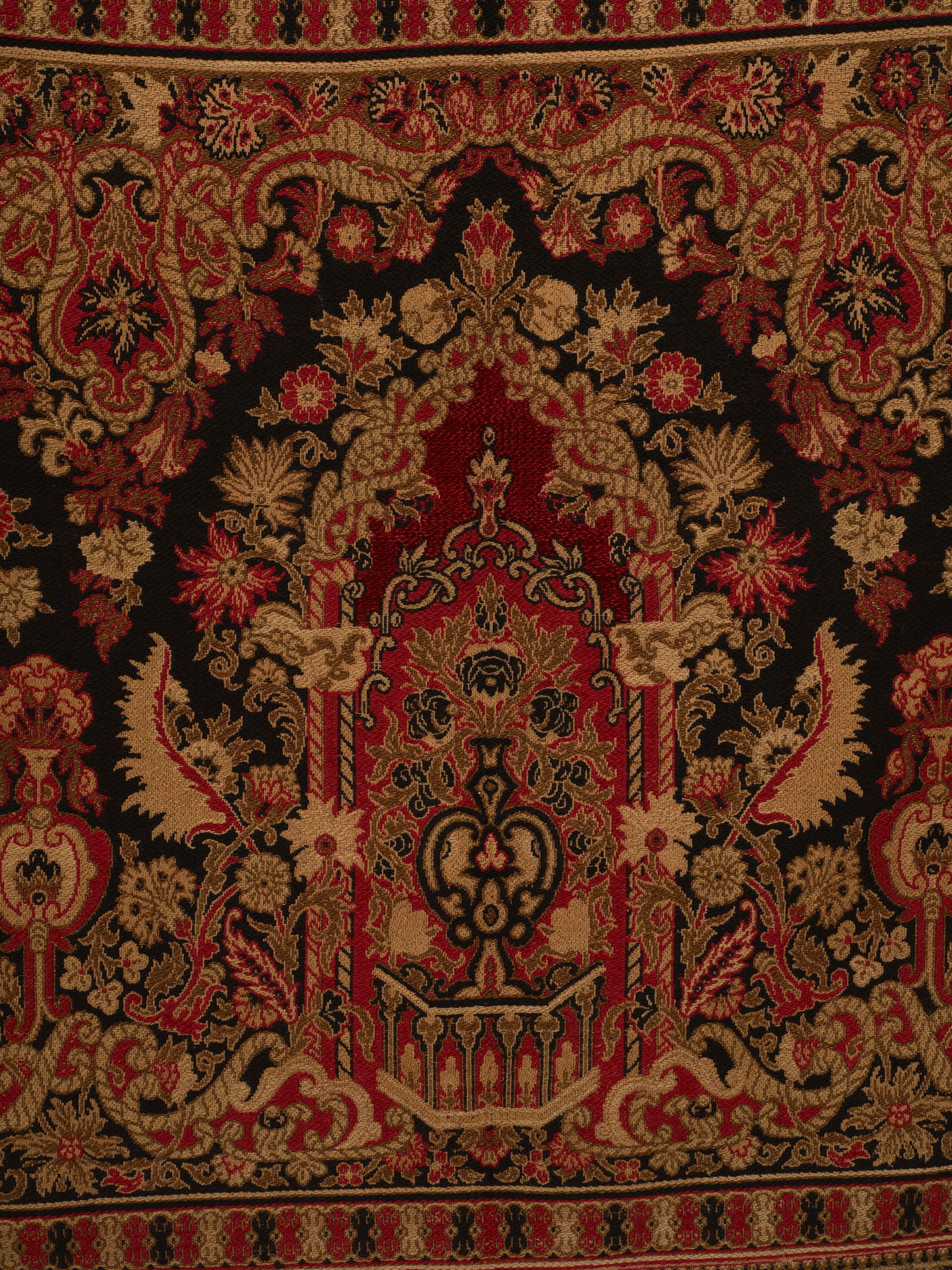 Panel. Jacquard woven. Polychrome wools with chenille accents. French. C.1870-90’s.. Fashionable during the late 19thC, this panel references Persian carpets with stylized urns, assorted florals, foliage, feathers, and scrollwork while using rich traditional primary colors.