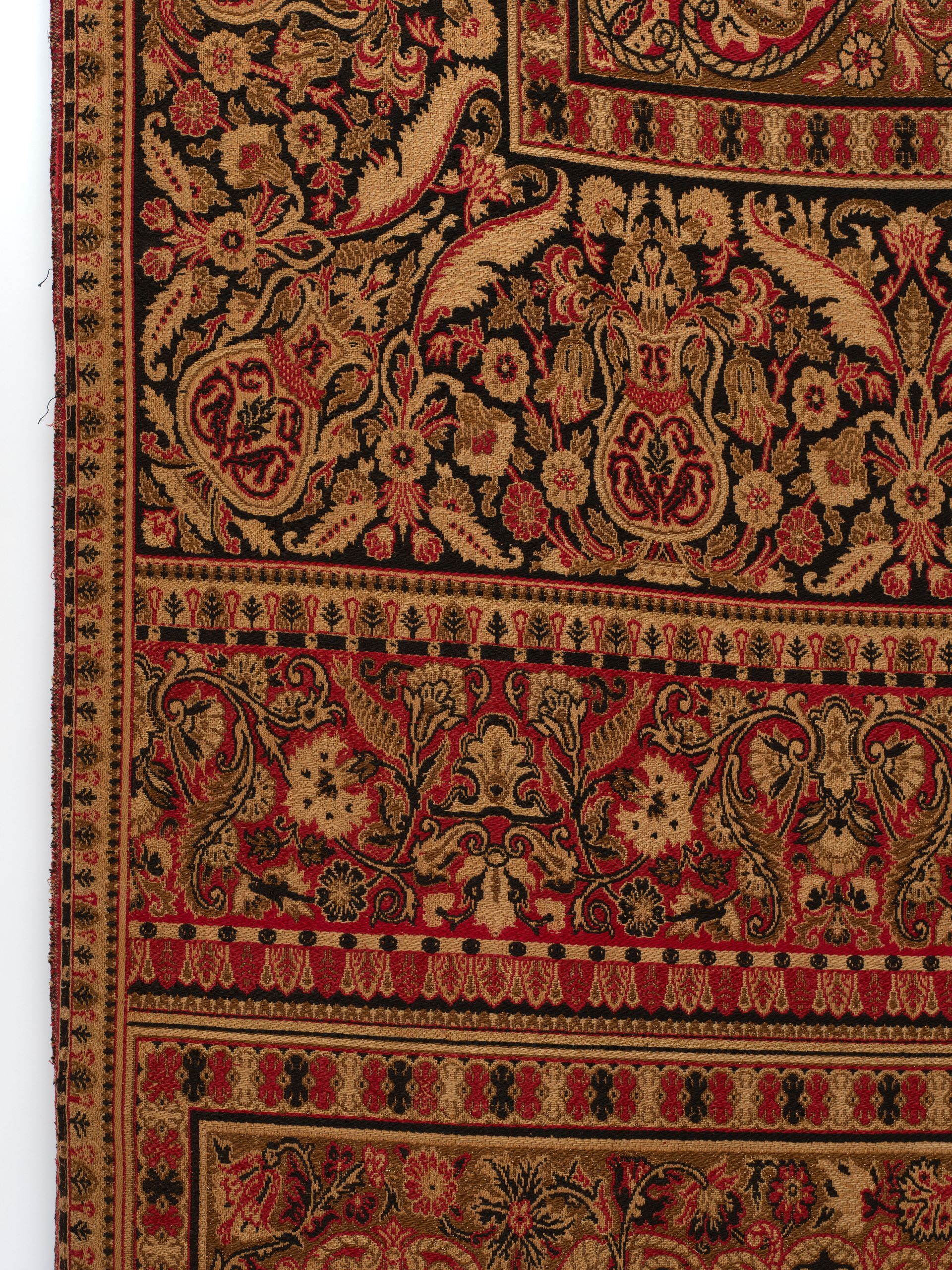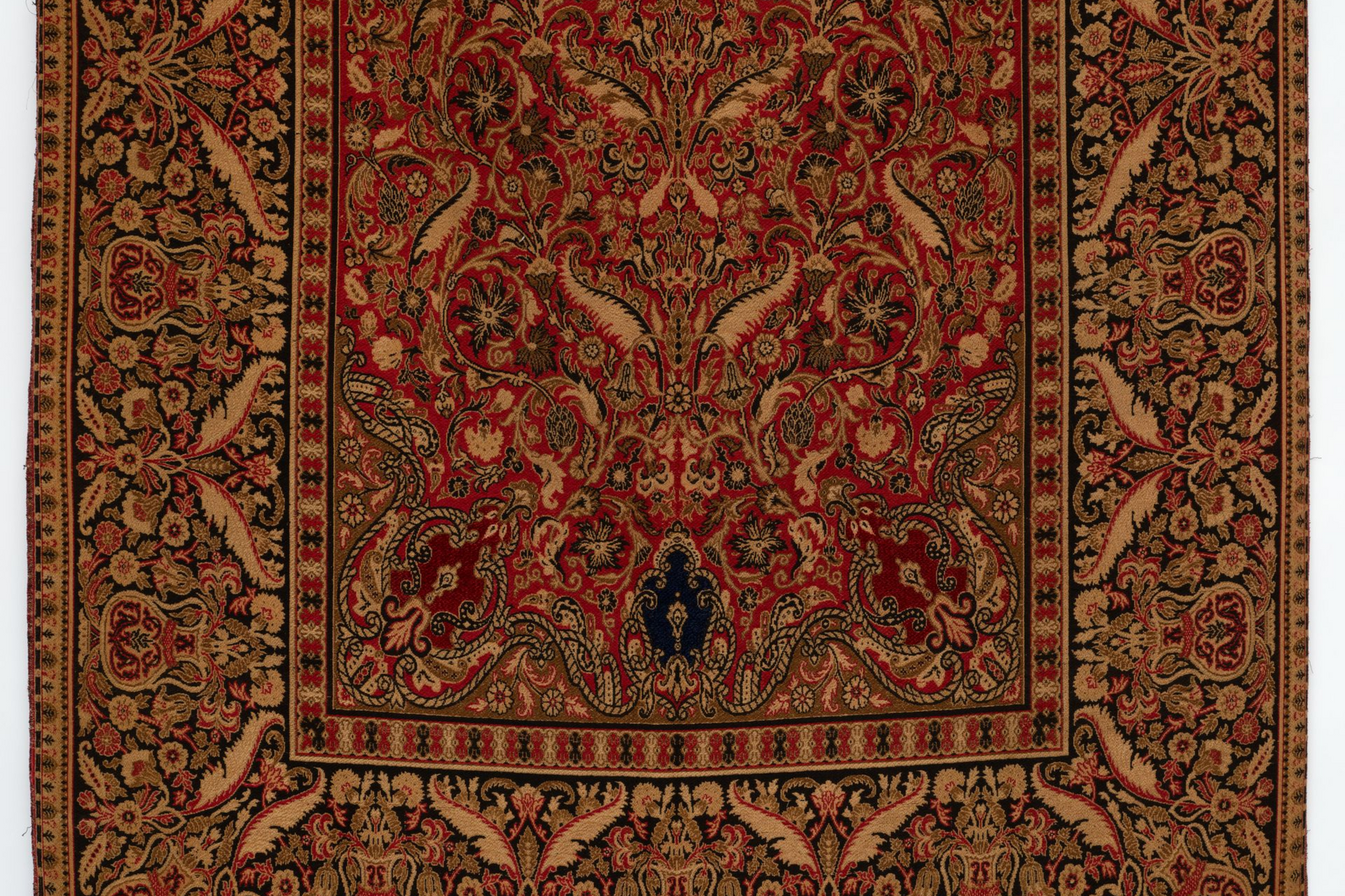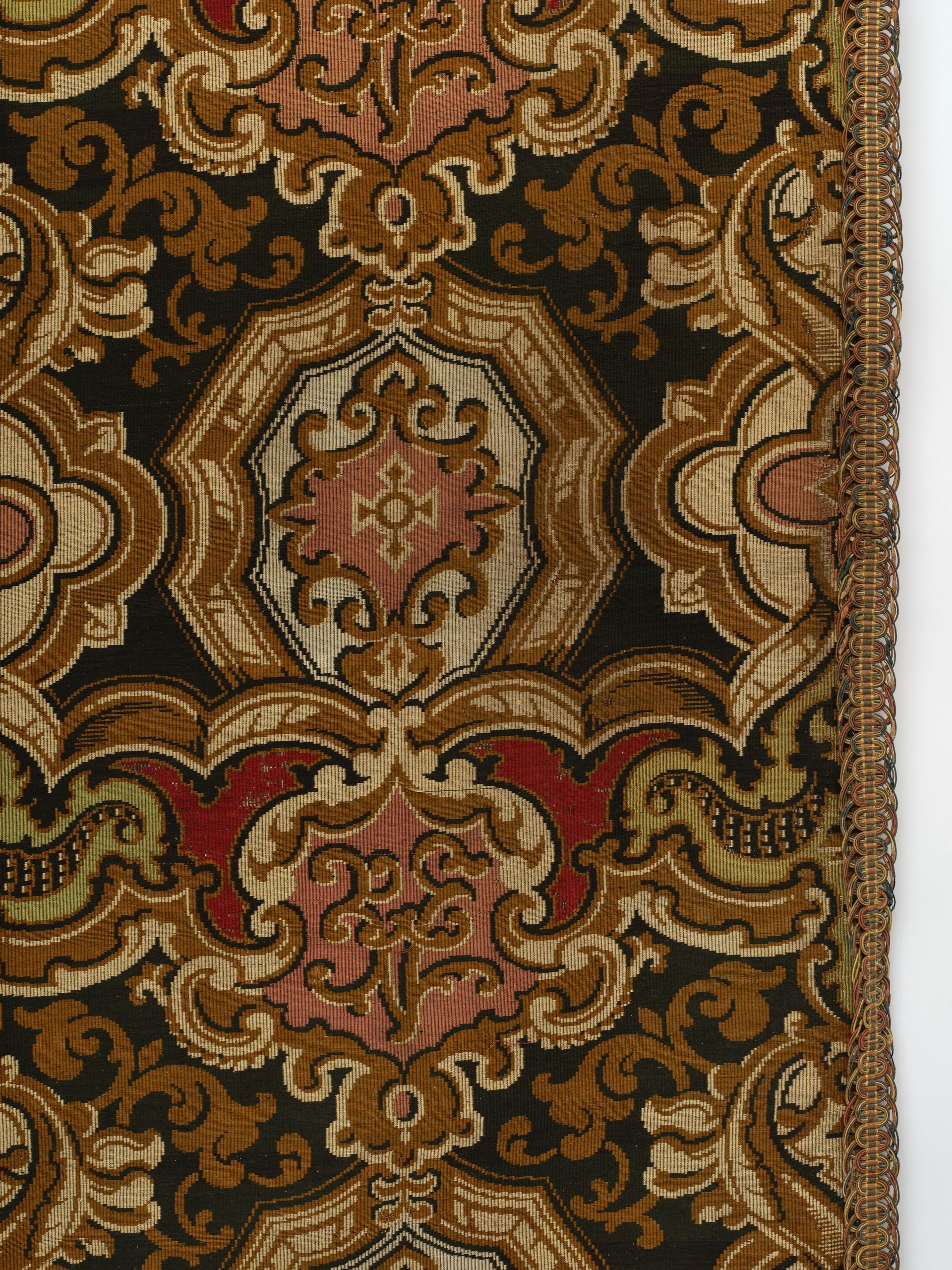 Panel. Jacquard woven. Polychrome wools with chenille accents. French. C.1870-90’s.. Fashionable during the late 19thC, this panel references Persian carpets with stylized urns, assorted florals, foliage, feathers, and scrollwork while using rich traditional primary colors.
