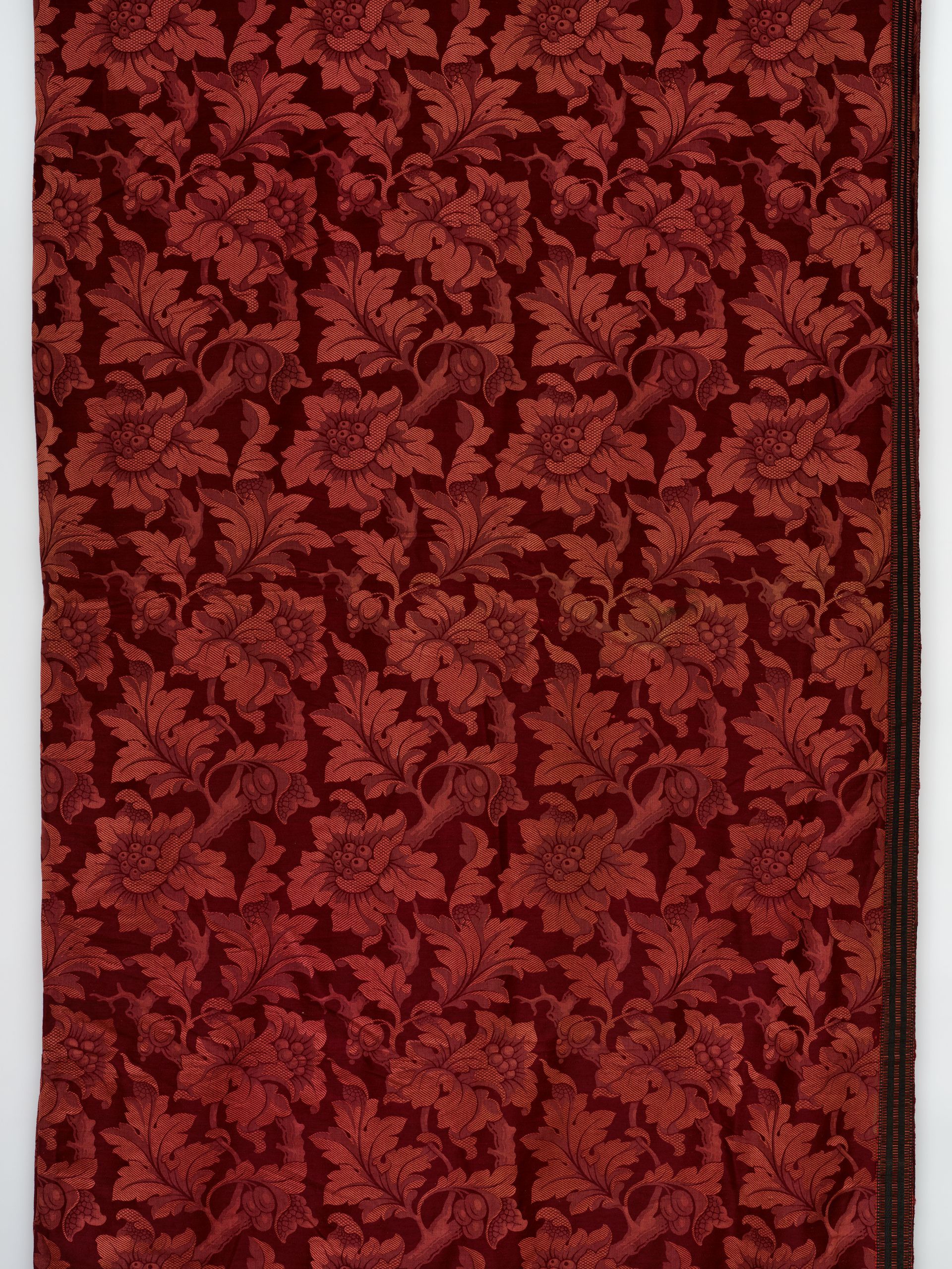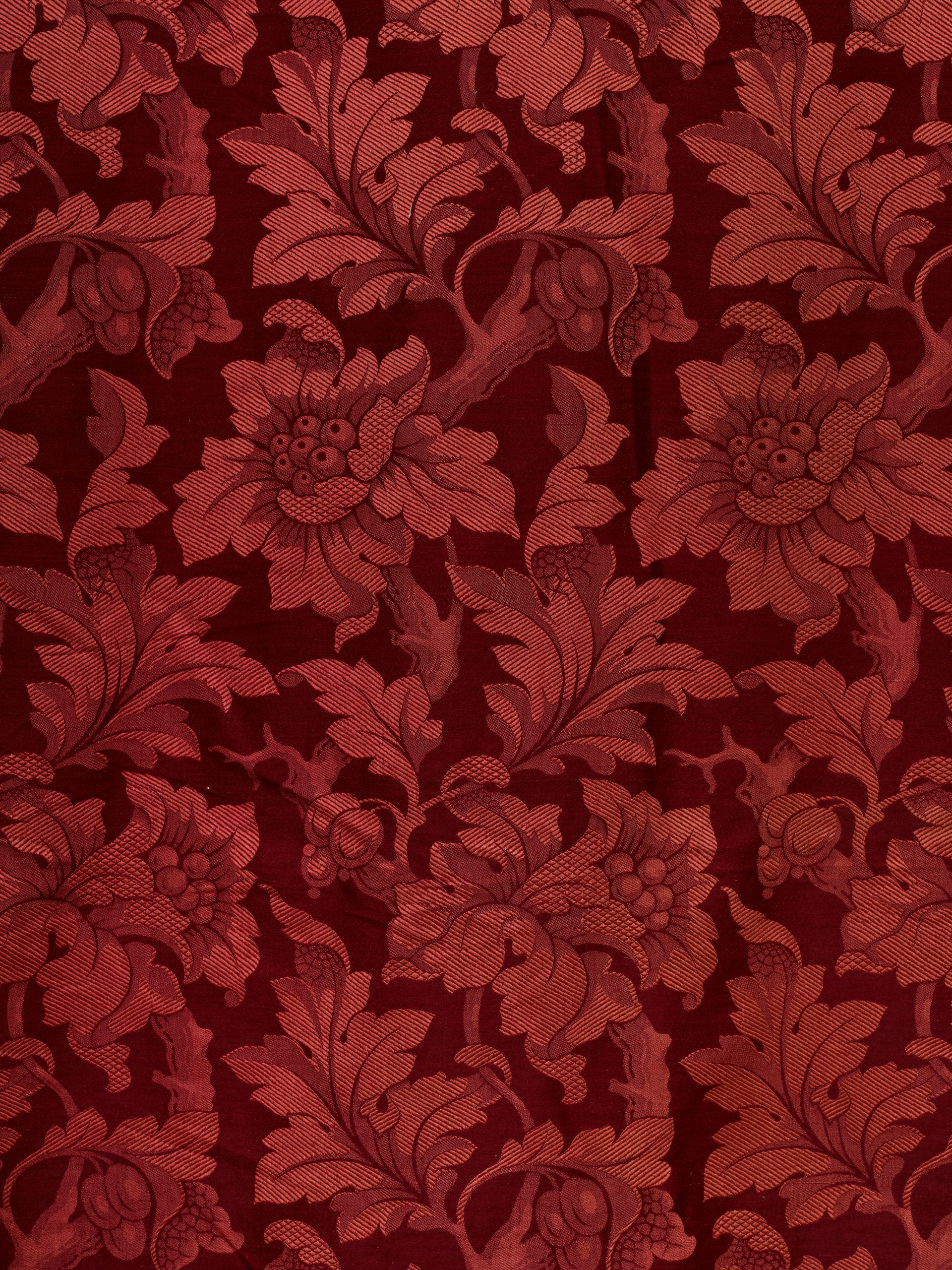 Panel. Jacquard woven. Wool damask. Two tone flowering vine and leaf repeat in maroon. European. C. 1820 / 1850 - 9’ x 9’