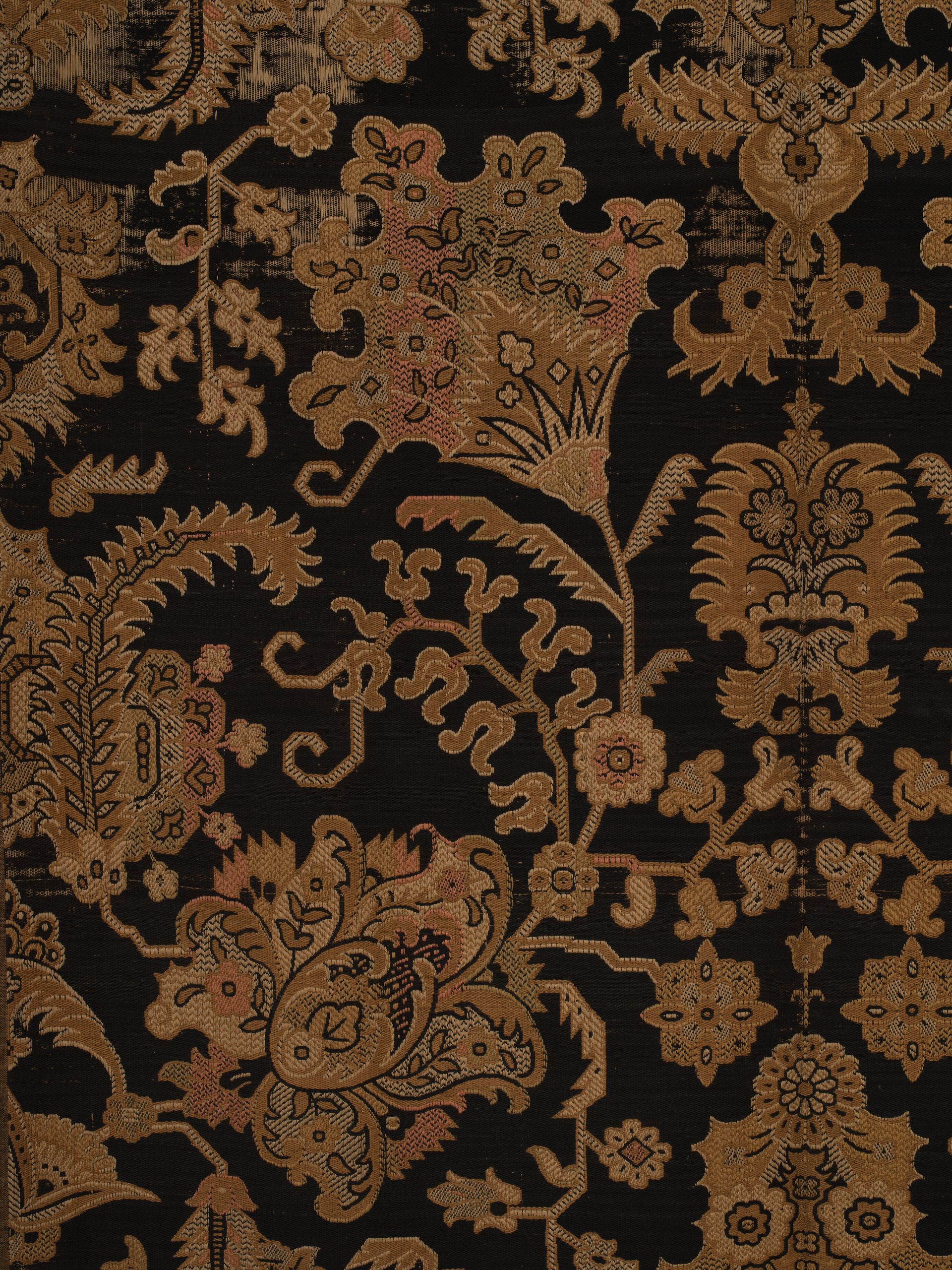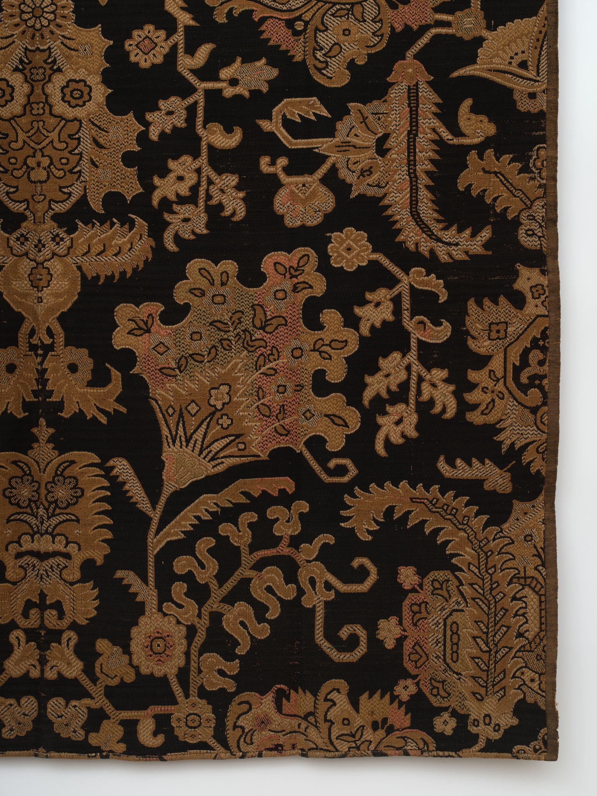 Intricate aesthetic movement design with large lotus fans, black gold and copper color beautiful piece. Traditional symmetrical Ottoman rug motifs of stylized florals and foliage on earth toned ground.