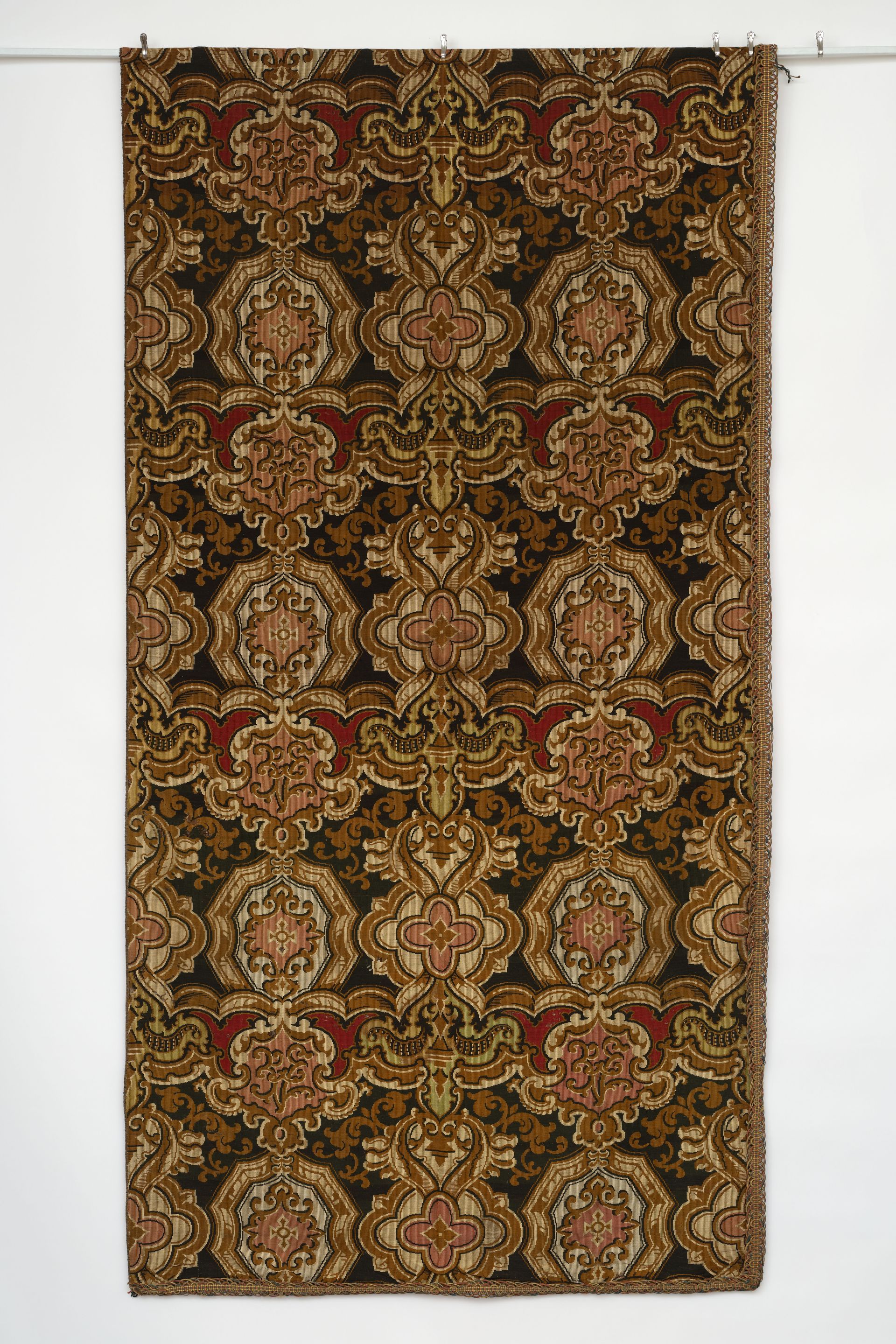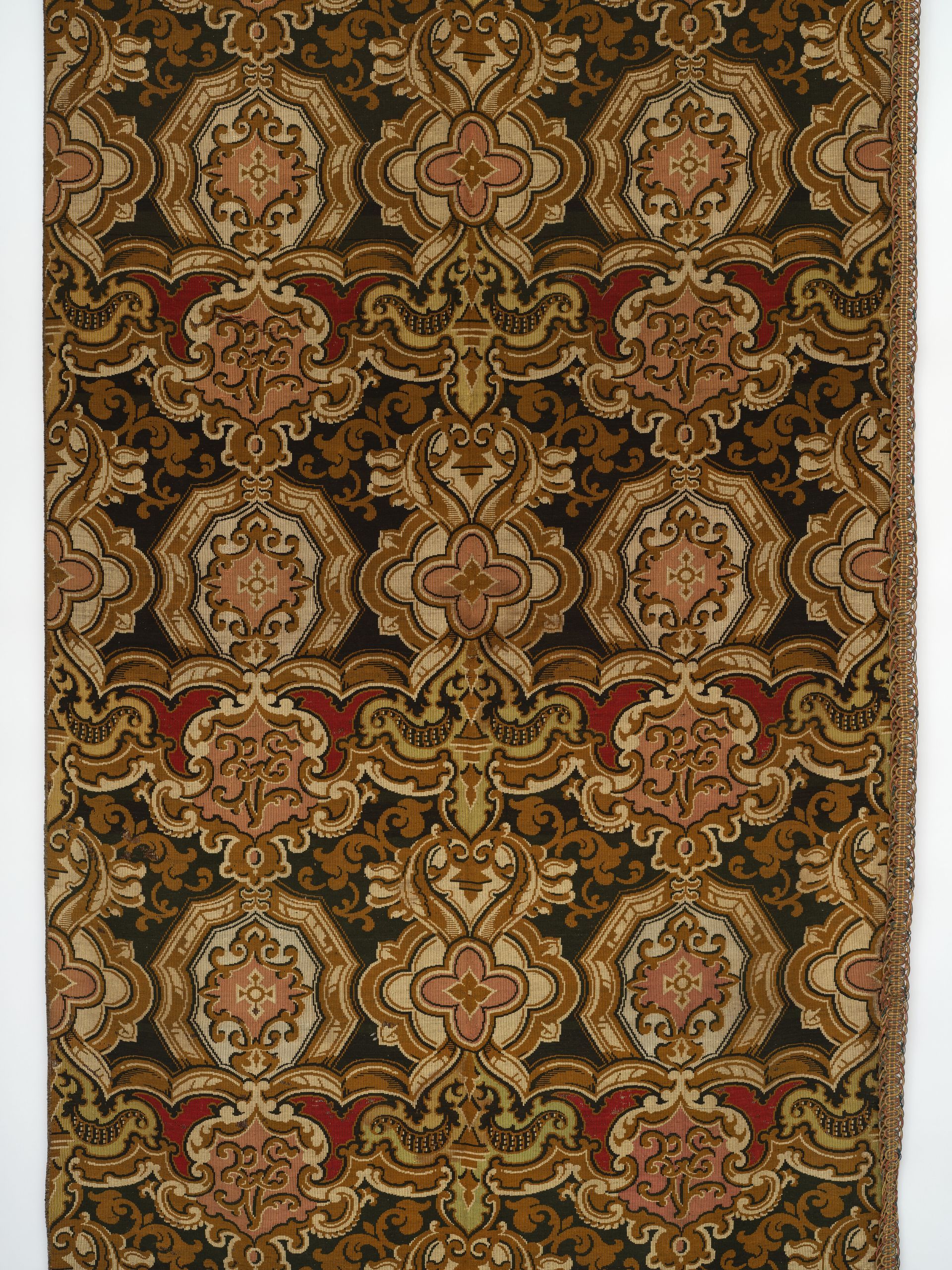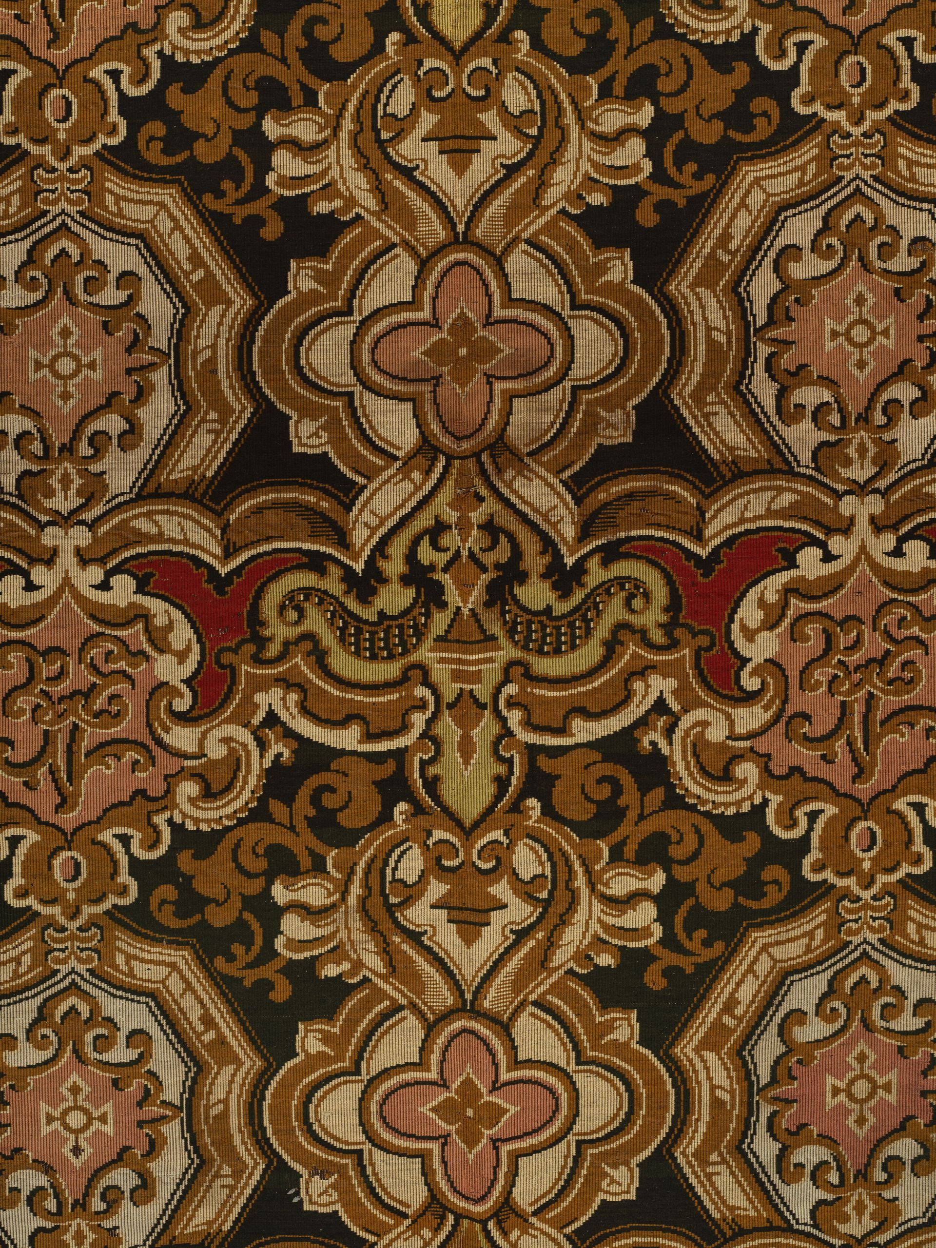 Jacquard woven. Polychrome Wools. Symmetrical, non-specific heraldic repeat with assorted oversized medallions. French. 1860-80. 9’ x 4.5'