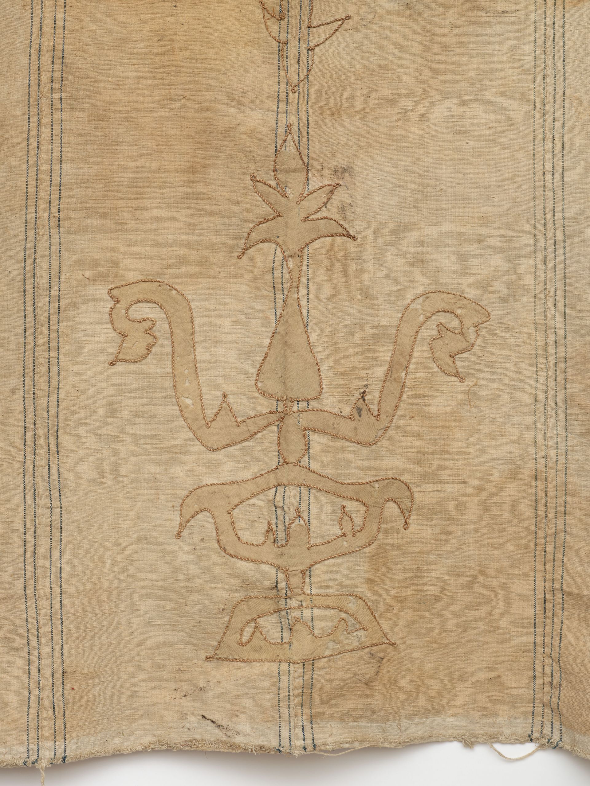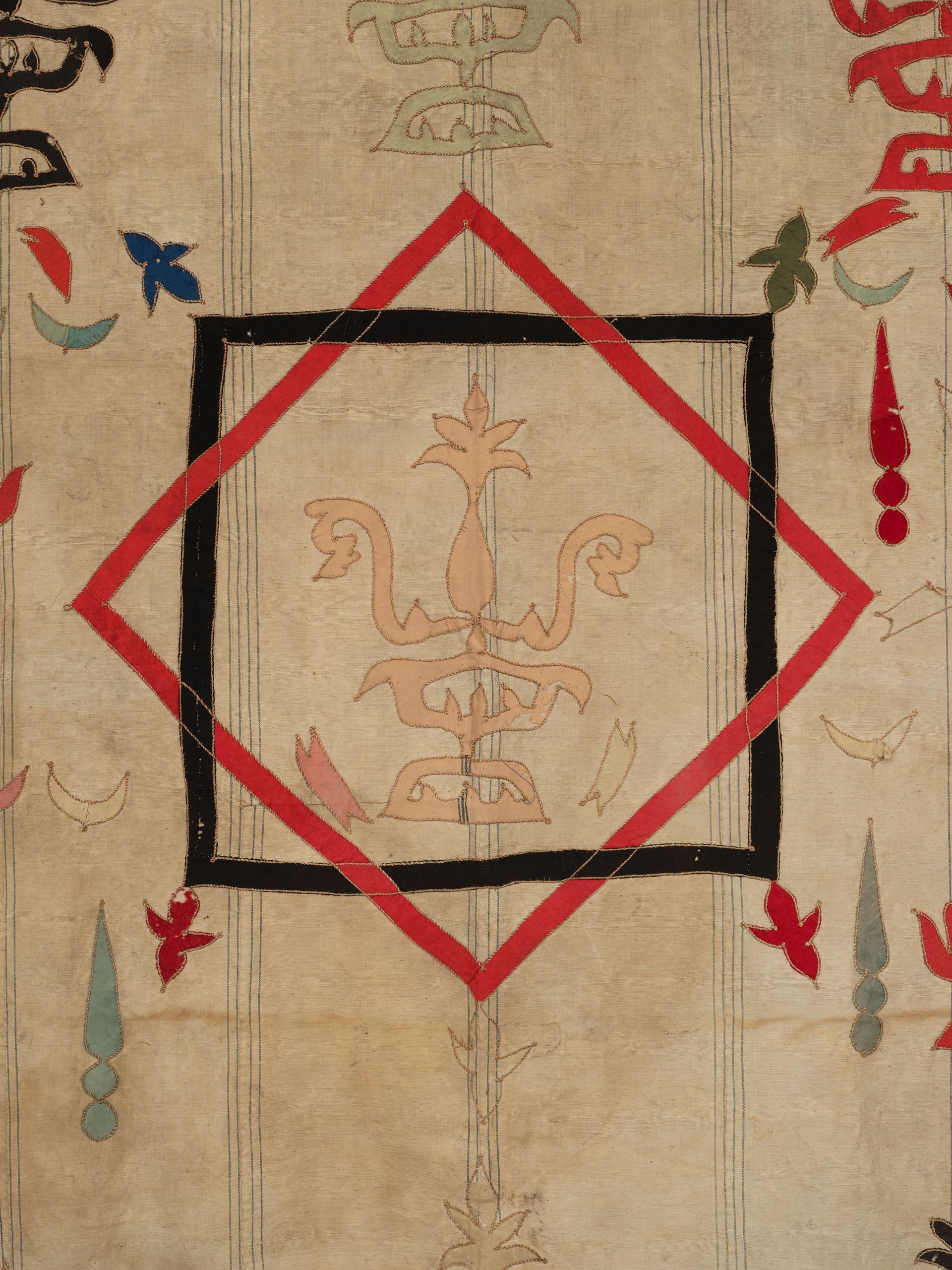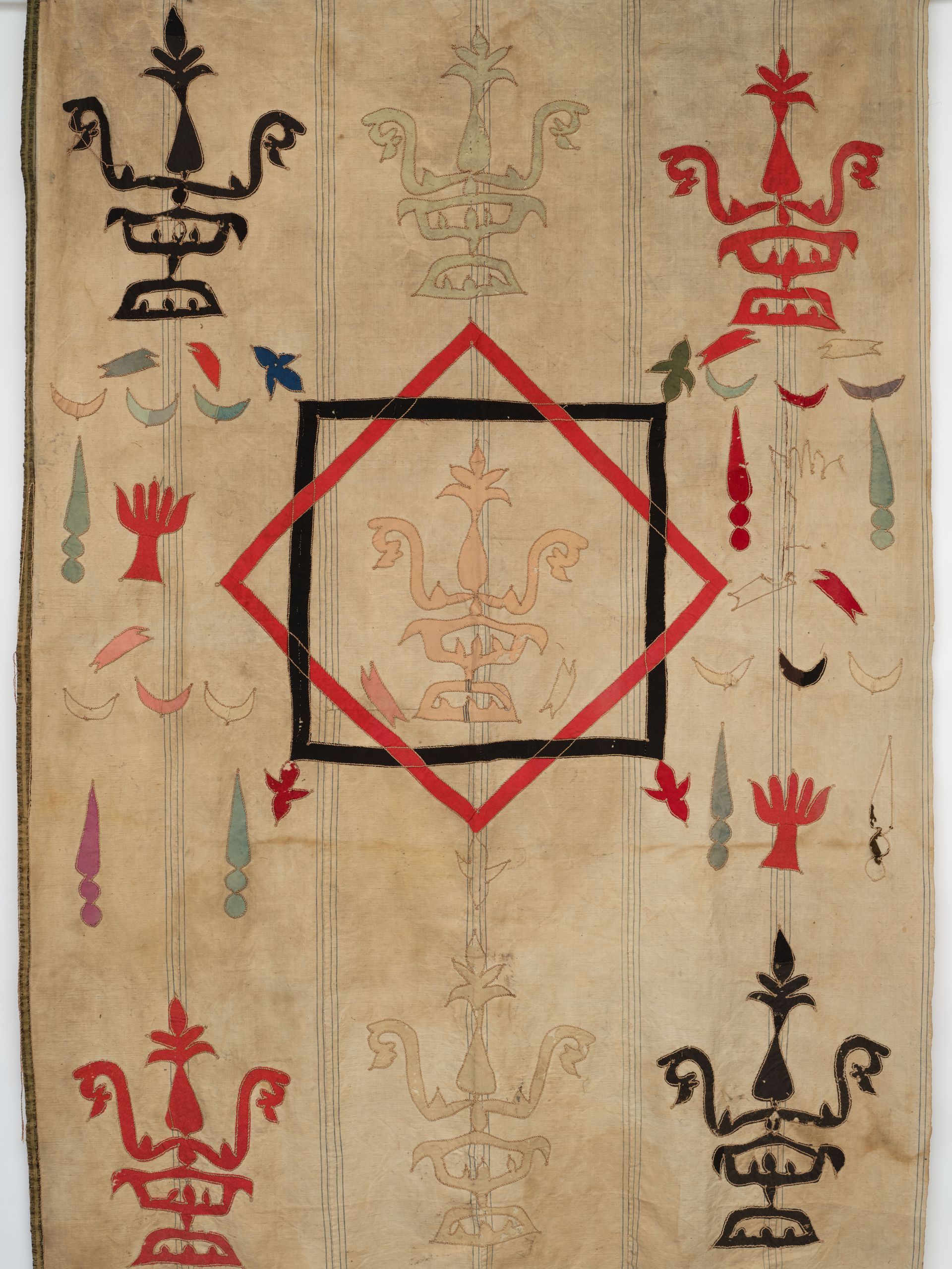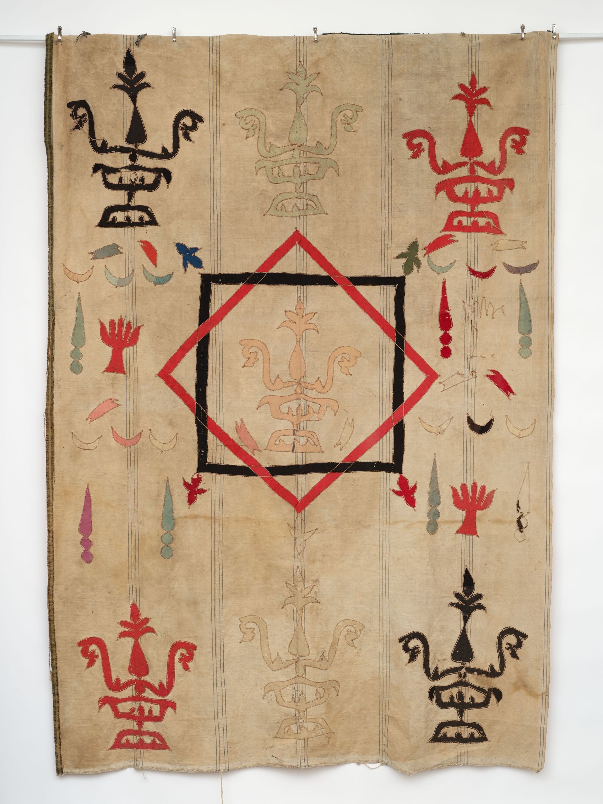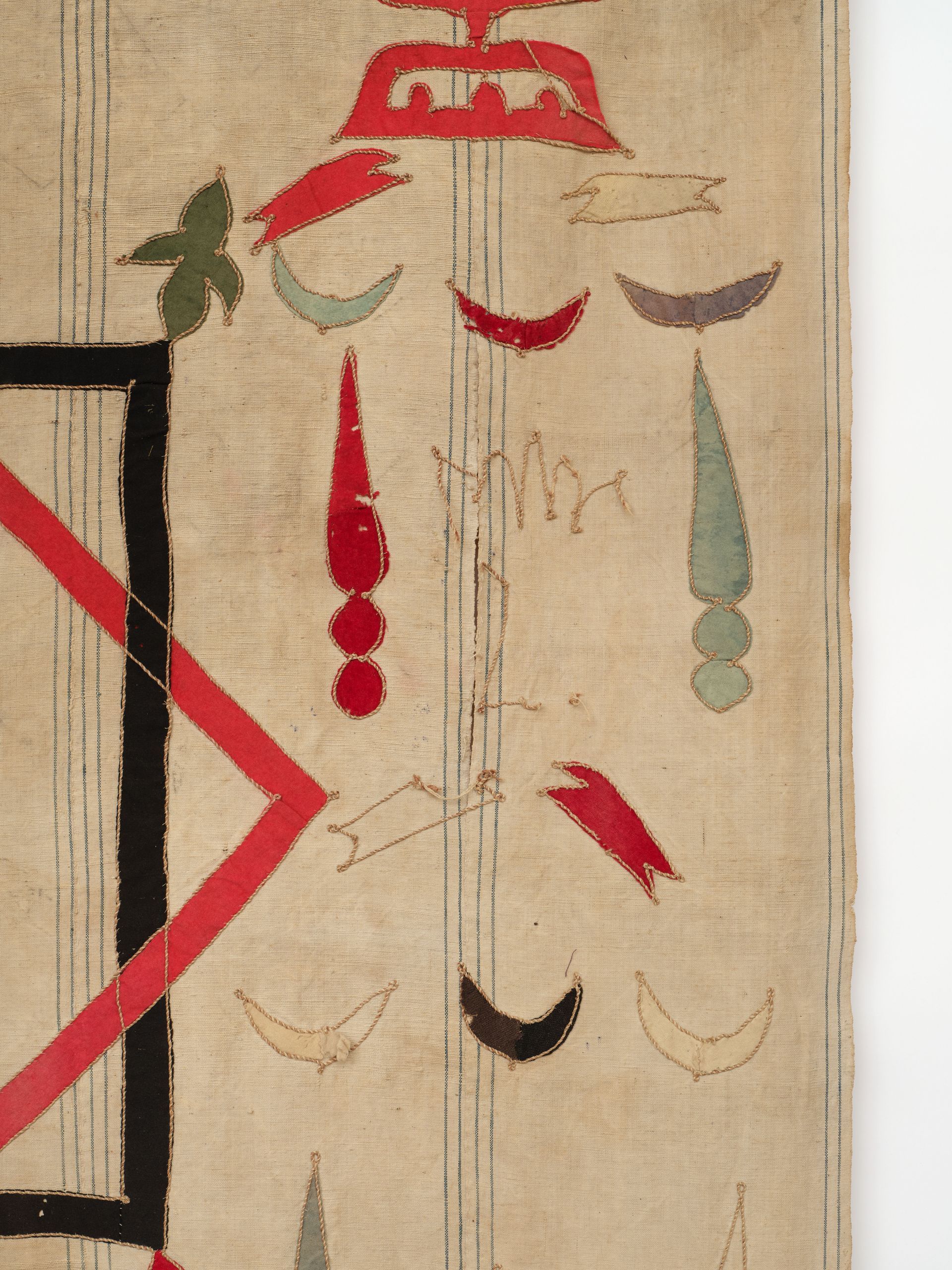 Wall Hanging. Woven linen. Decorated with a variety of individually appliqued, outlined, and hand colored unidentified symbolic devices. Attribution Uncertain. 108” x 6’