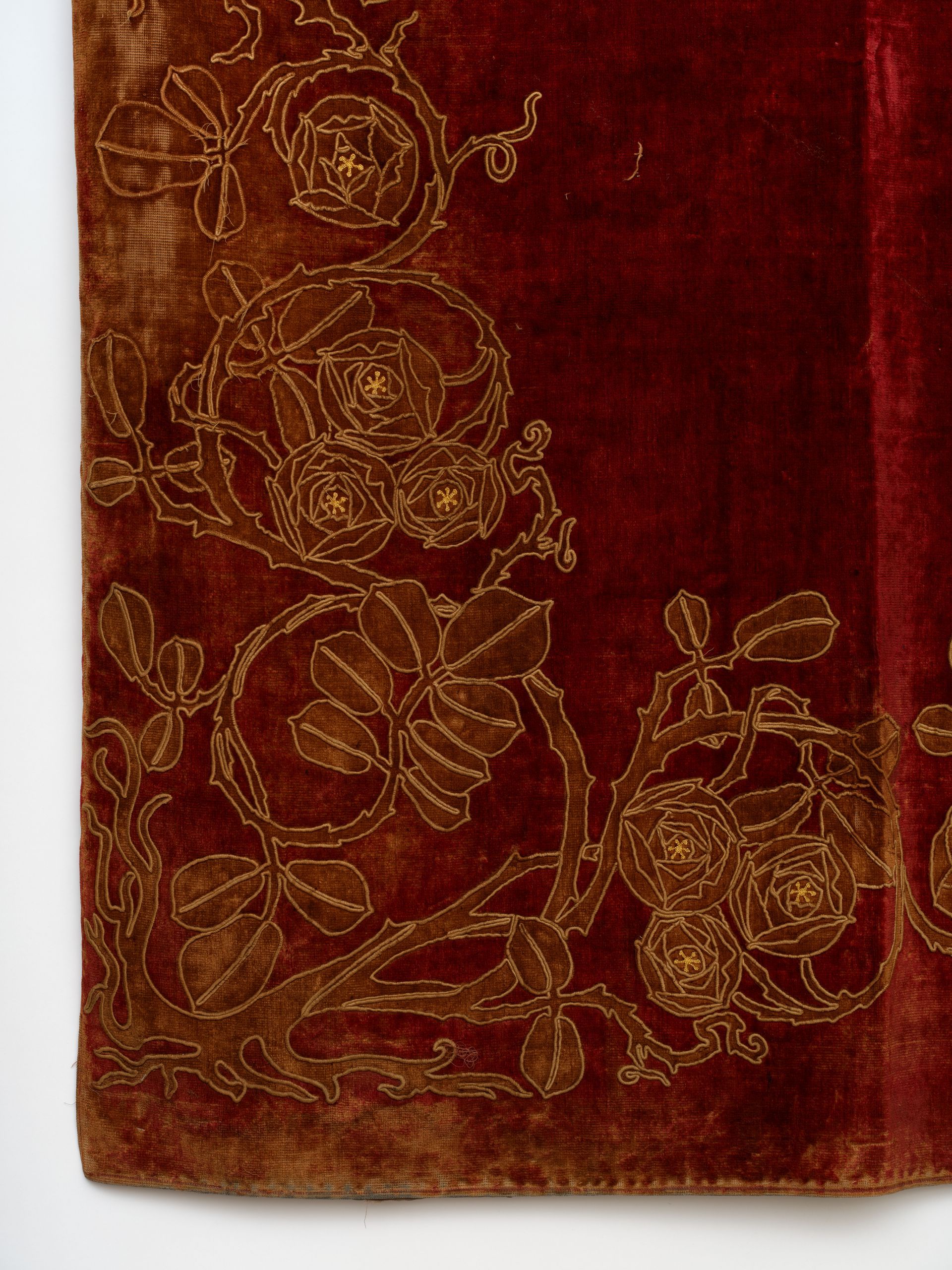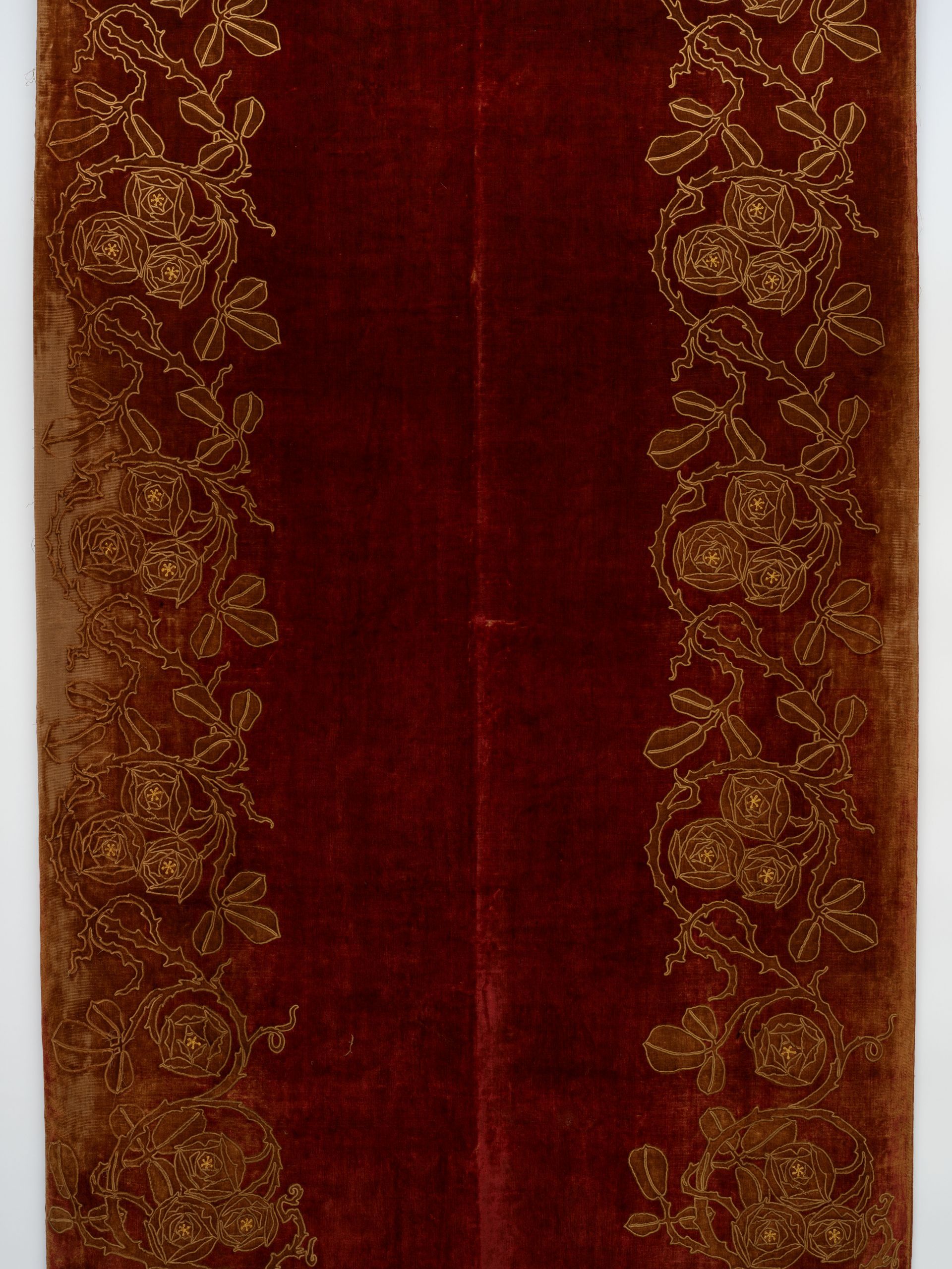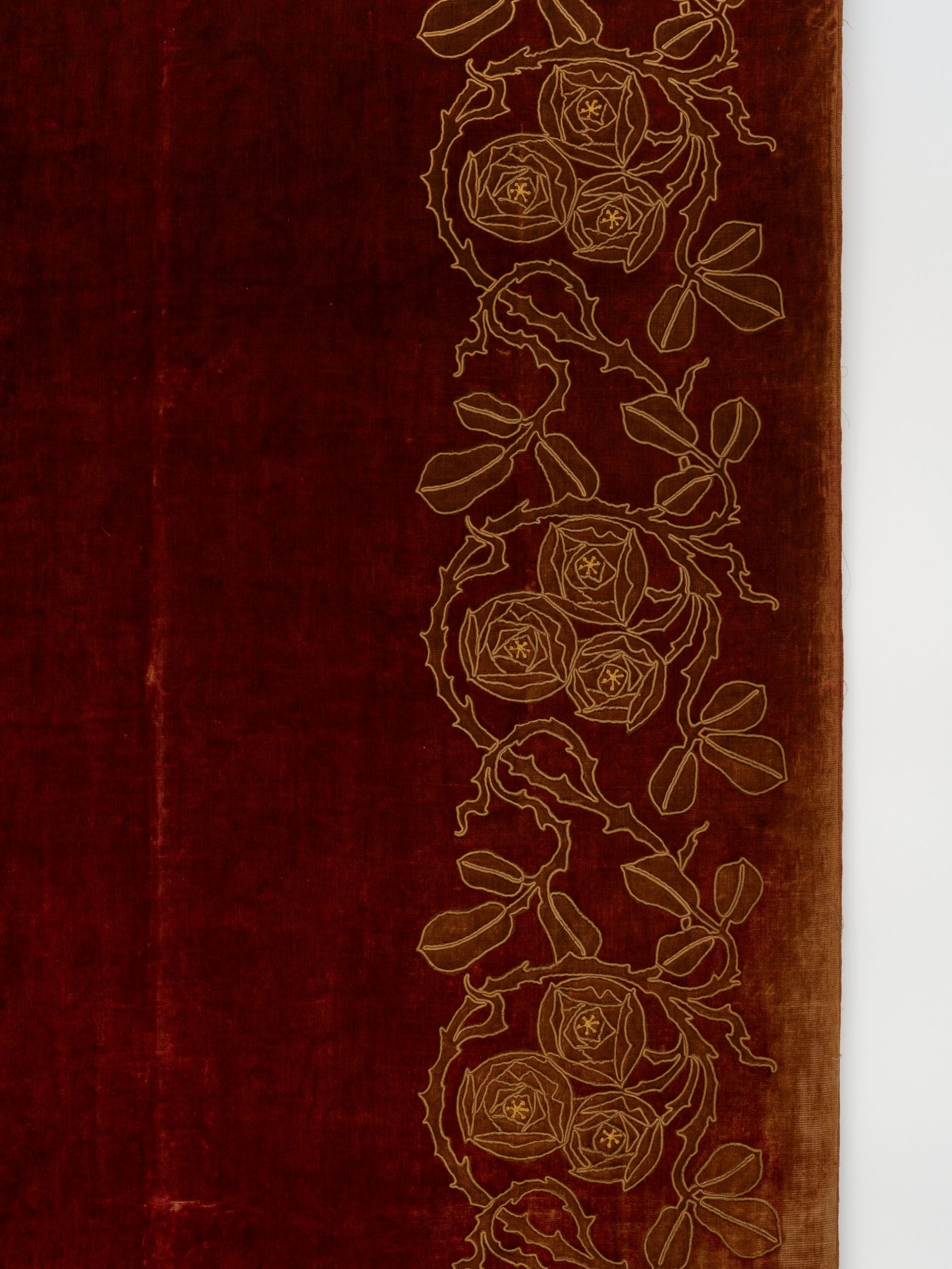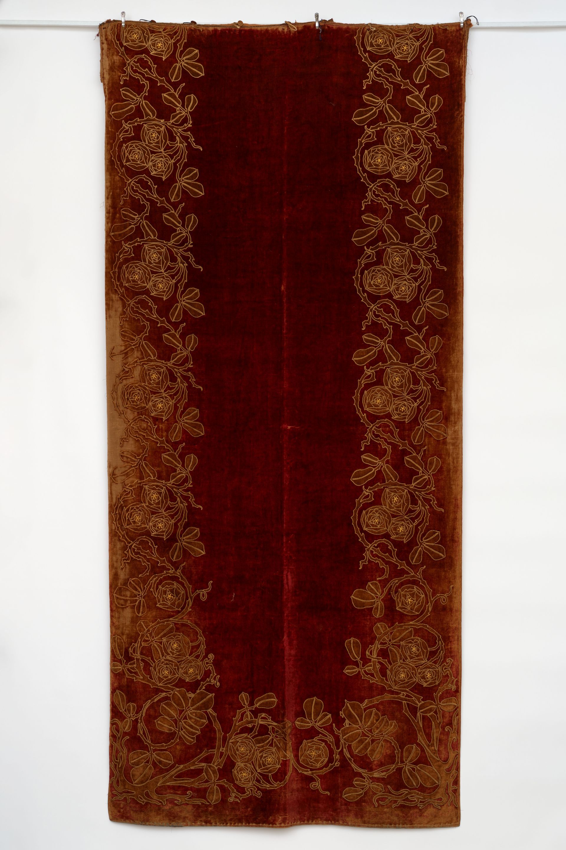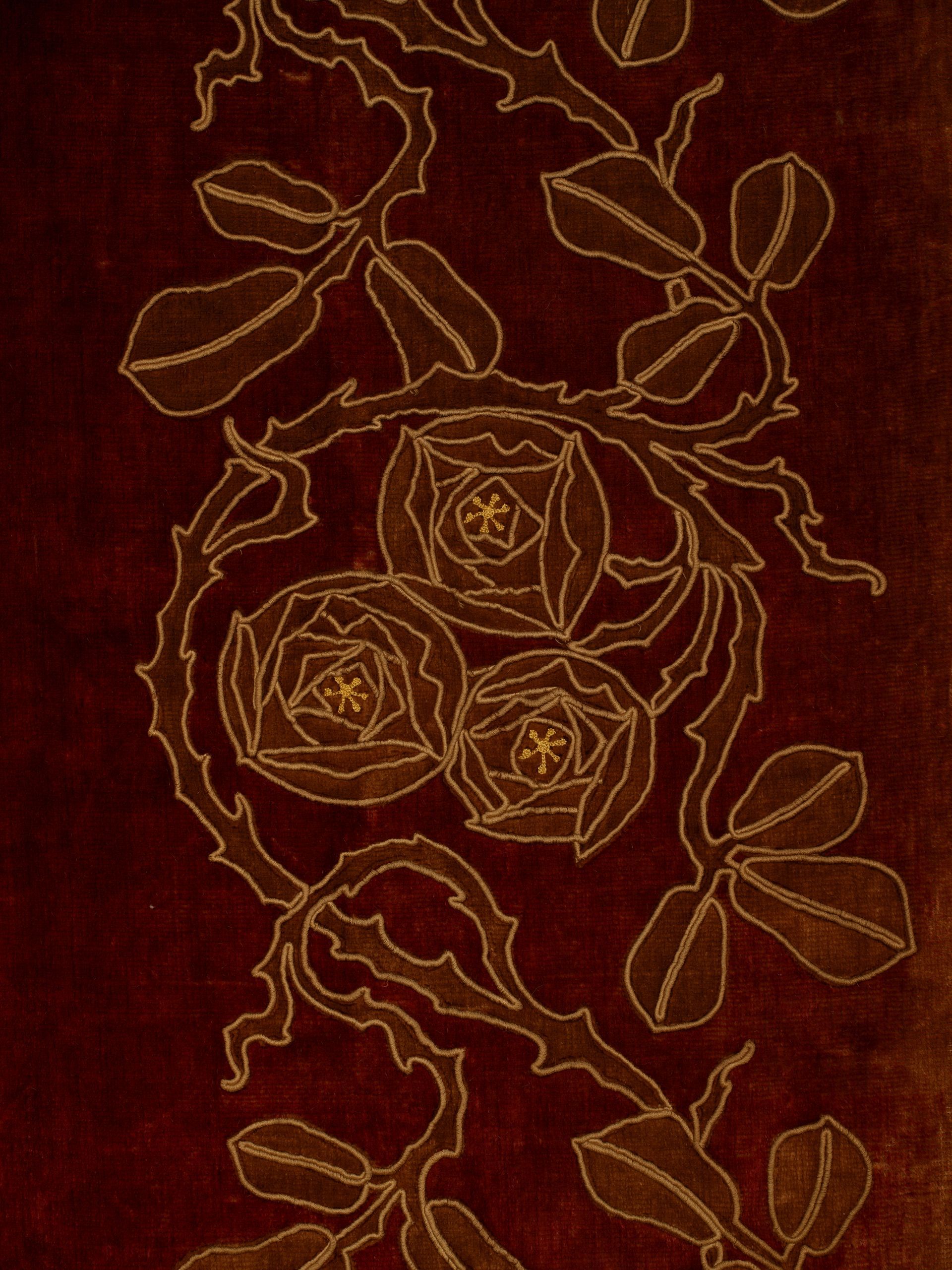 High style Arts & Crafts era, luxuriously embellished with appliqued and embroidered stylized roses and foliage amid scrolling vines. These hand done panels were discovered in England, to my delight, around 1999 and seriously reinforced my urge to travel.