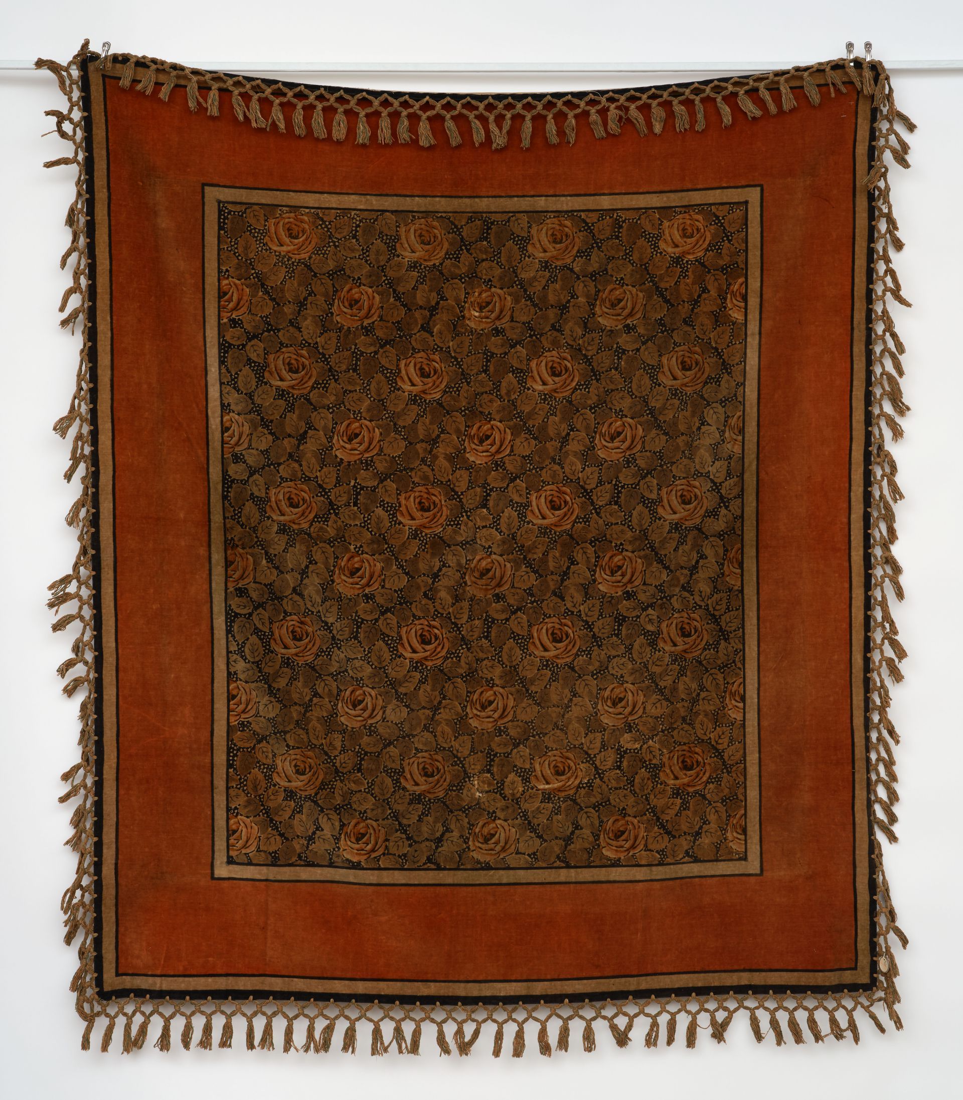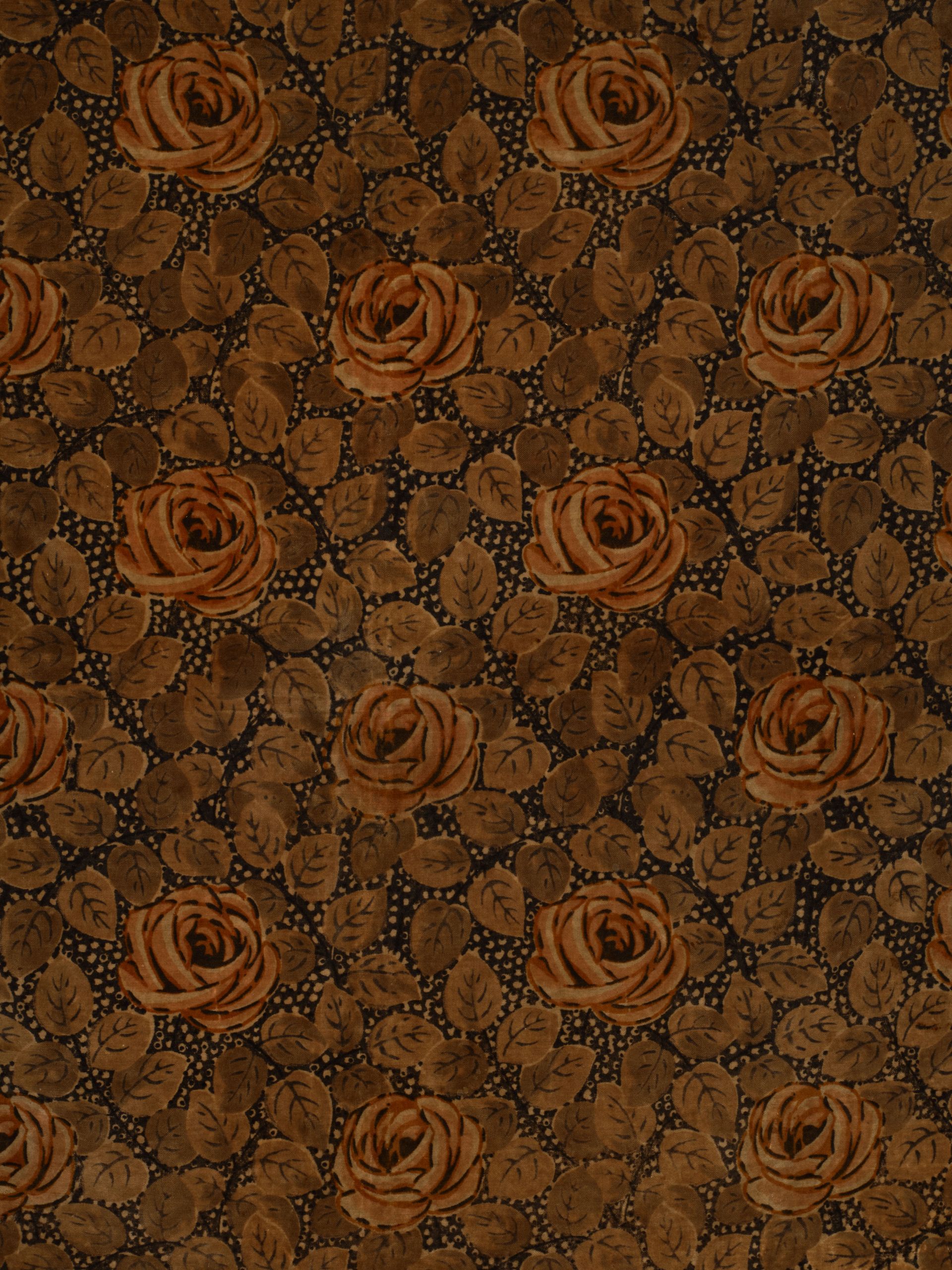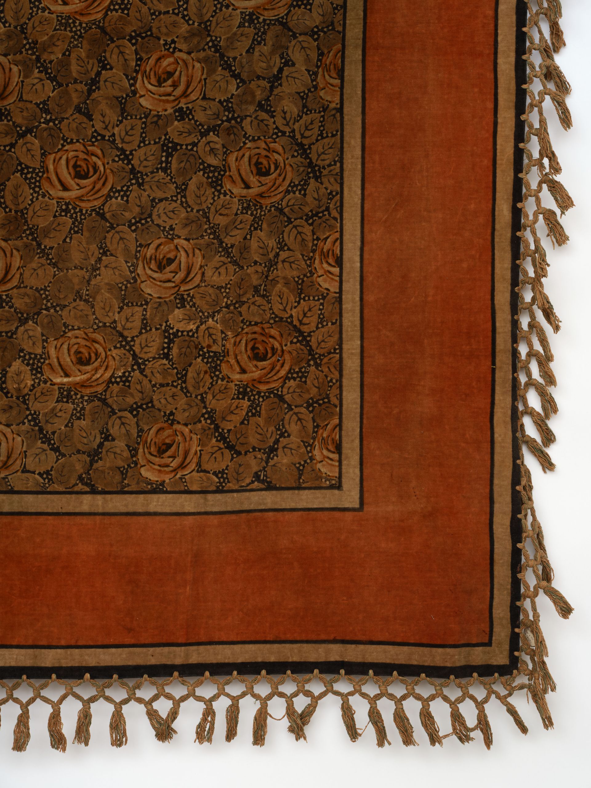Sophisticated Art Deco repeat of roses and scattered leaves on a black and white dotted ground, richly contrasted with bold surrounding outlined orange border. Delightful arts and crafts table cover. I have always appreciated English arts and crafts. Purchased in the English Midlands late 90s.