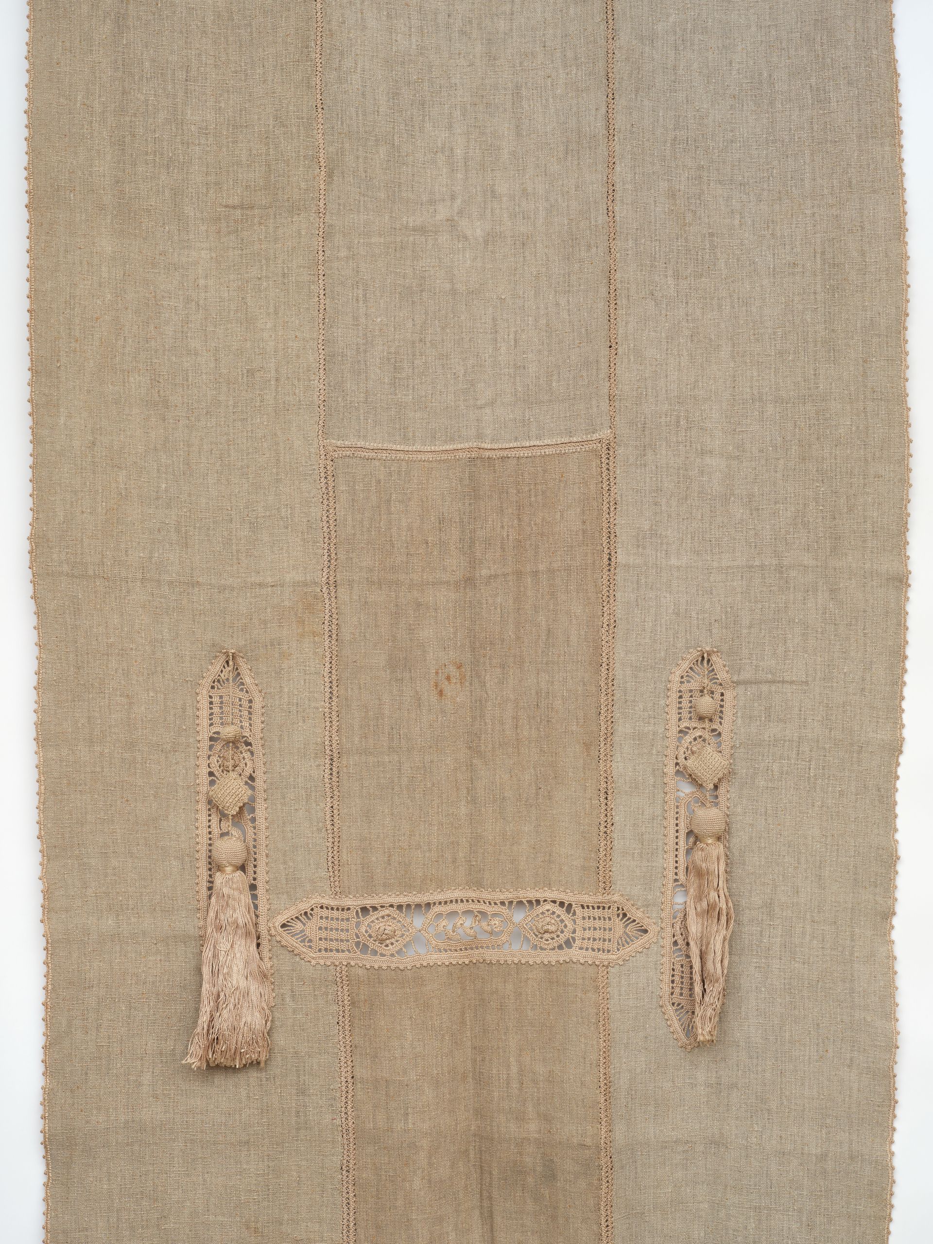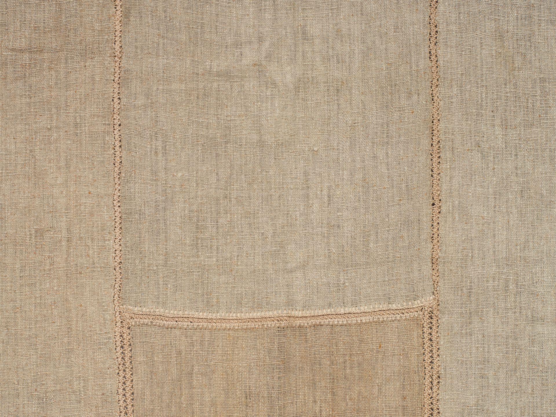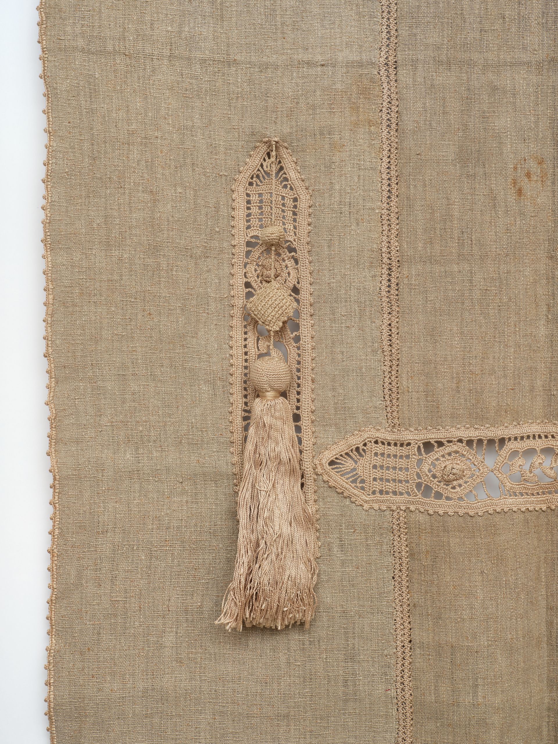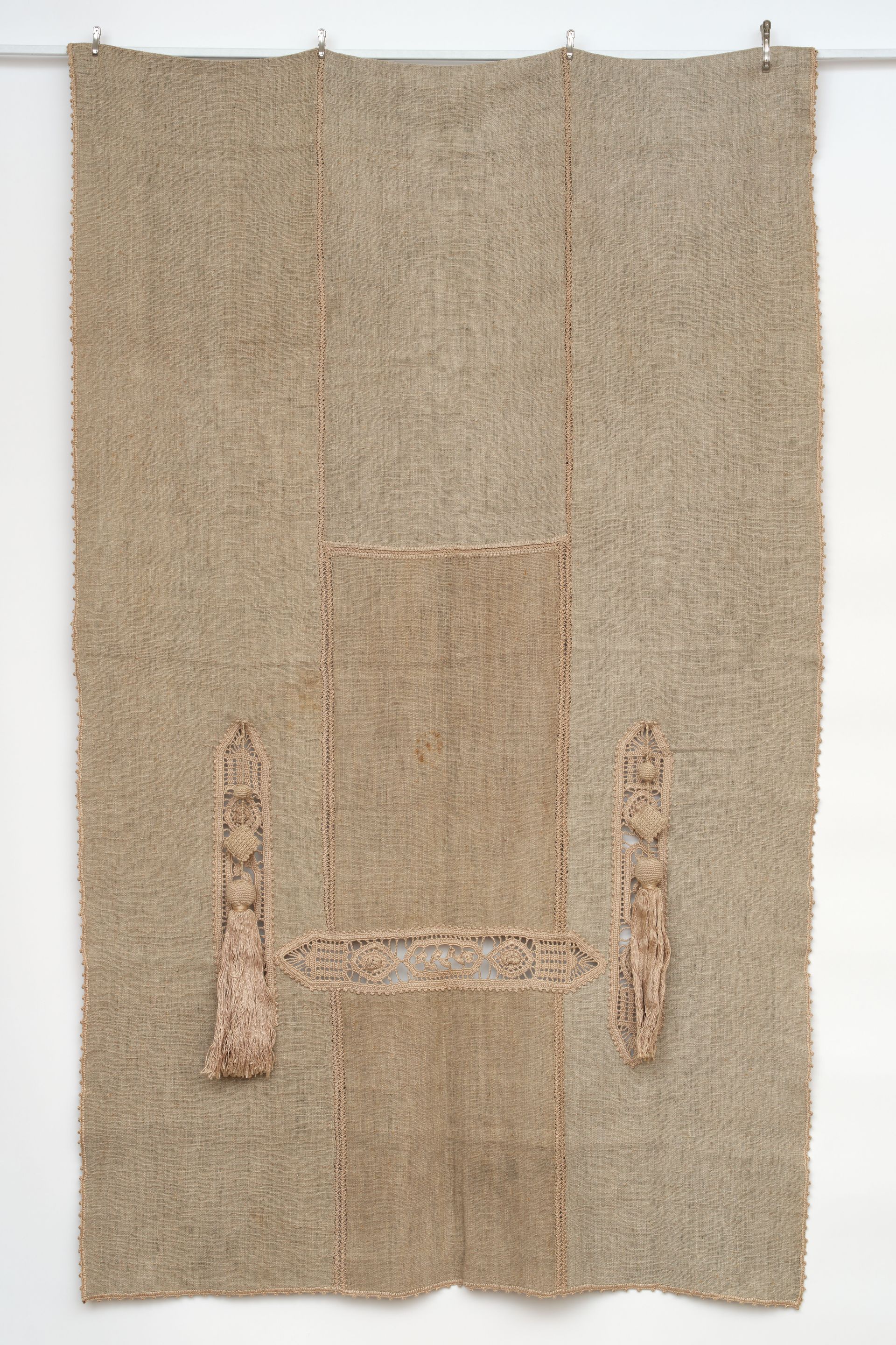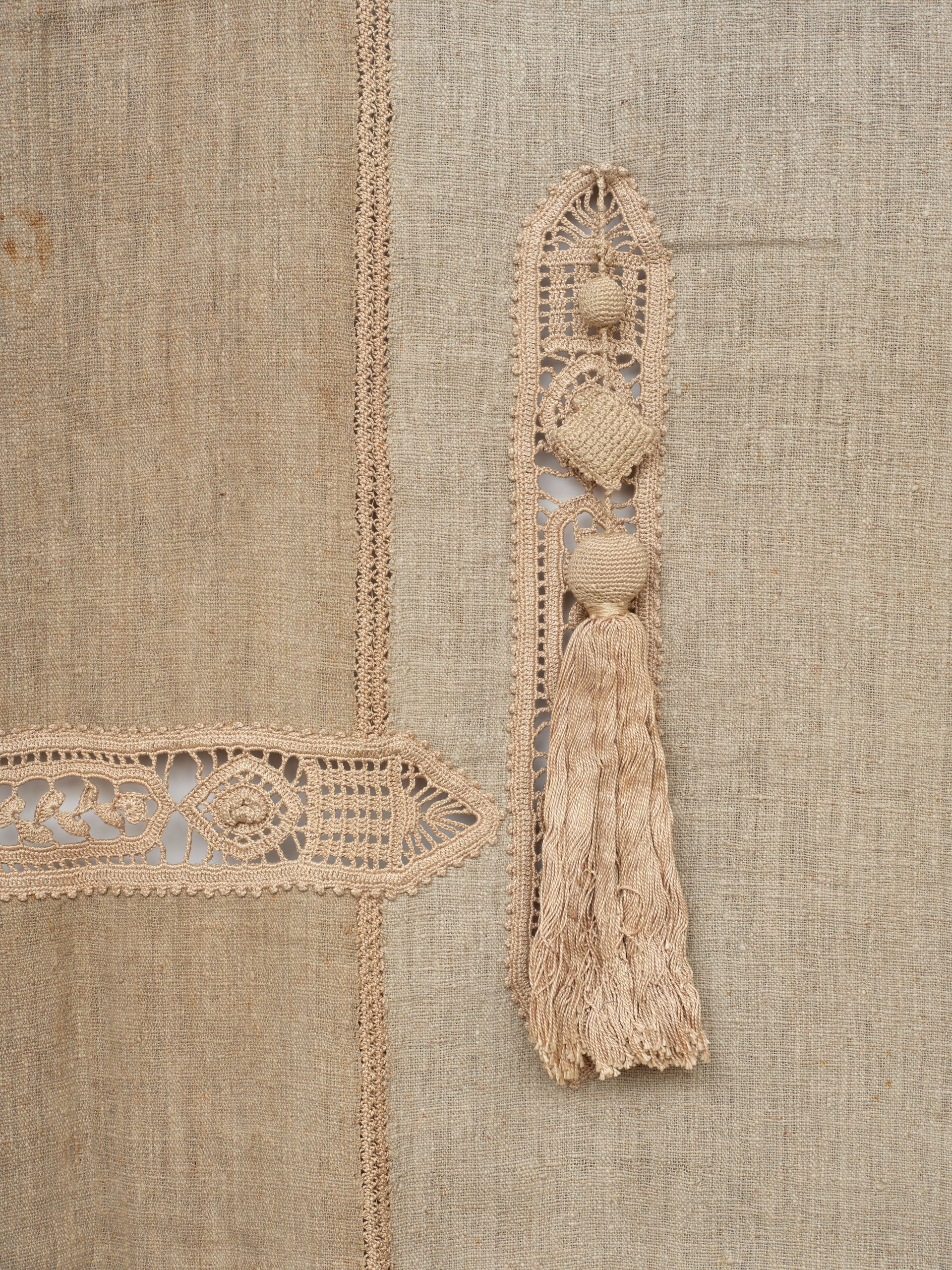 Portiere, one of a pair. Woven panels. Homespun natural linen. Cutwork, crochet lace embroidered details with two handmade tassels. C.1900. Arts & Crafts era minimalism at its finest. I'm not sure they are American made, but the minimalist nature of its overall presentation really lends itself to early American arts and crafts.